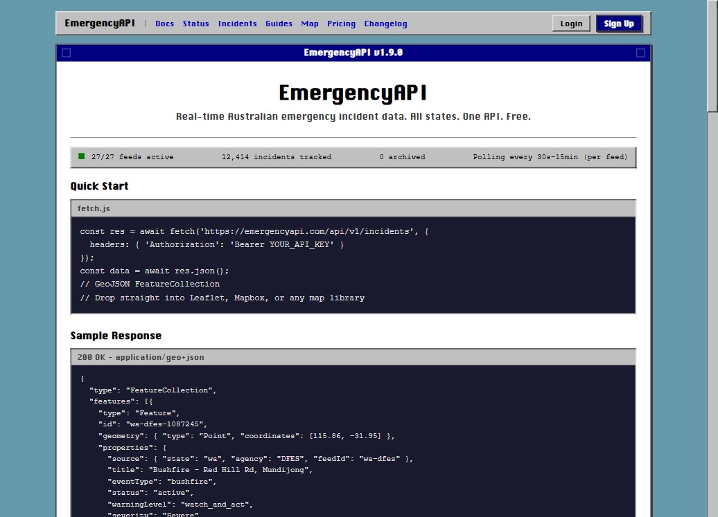 The free tier gives developers 500 requests per day with no credit card or approval required. Feeds are polled every 30 seconds to 15 minutes depending on the source, and the API follows the CAP-AU (Common Alerting Protocol Australian Profile) standard.